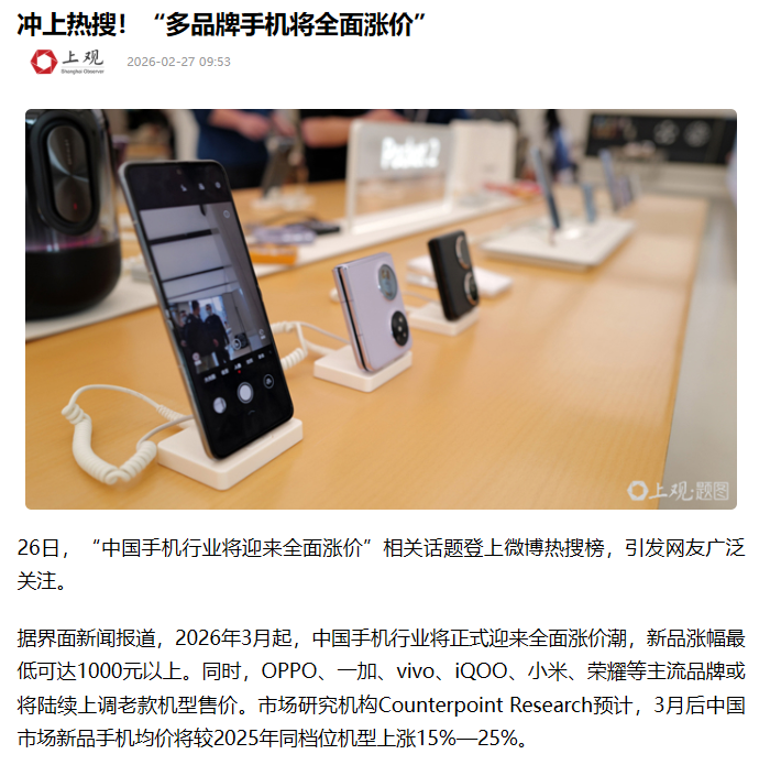 微博热搜上,“#中国手机行业将迎来全面加价#”的词条高挂,2700多万次的阅读量背后,是数千万忽地者的暴燥。这不是某个品牌“飘了”,这是所有这个词上游供应链的集体抵御。